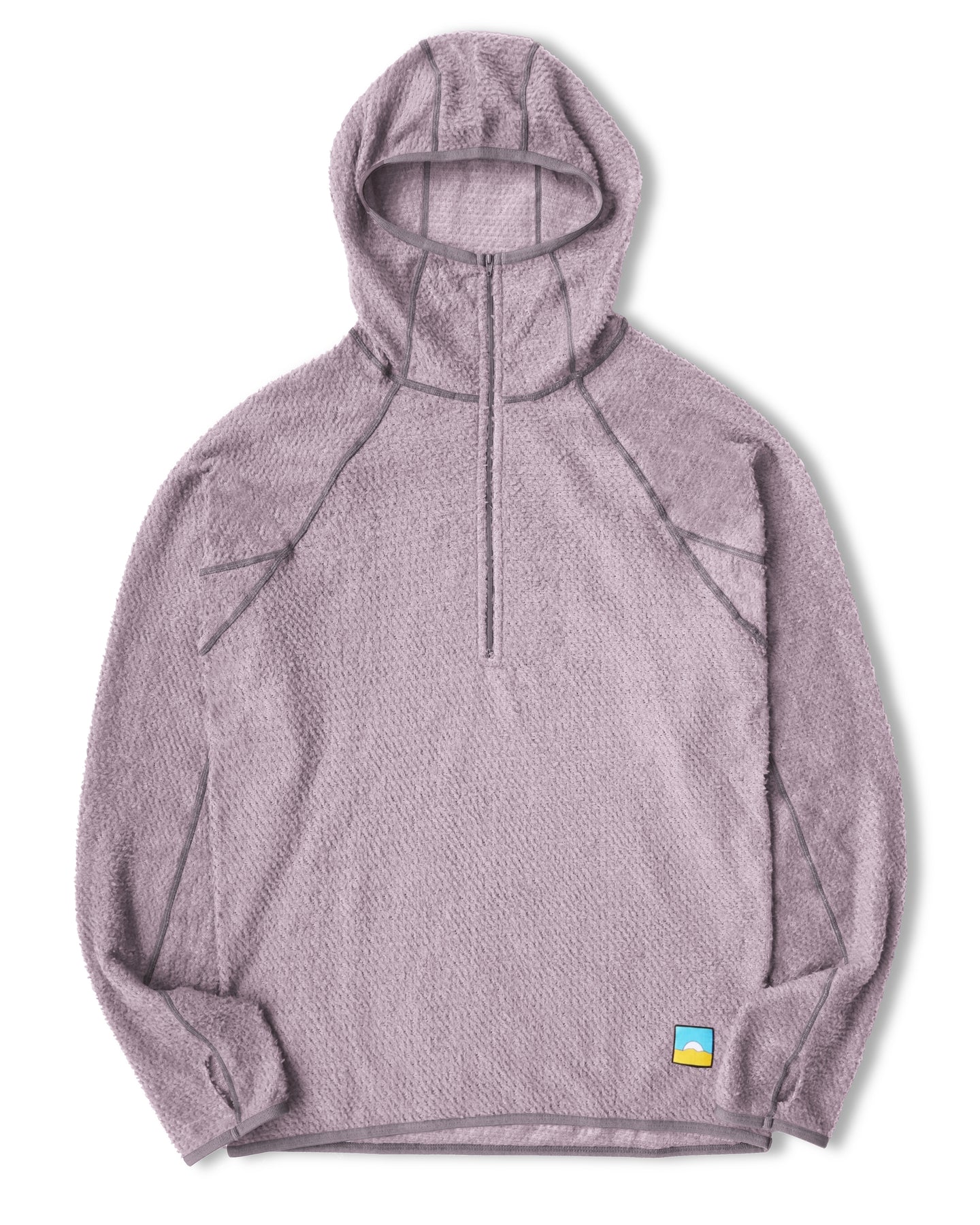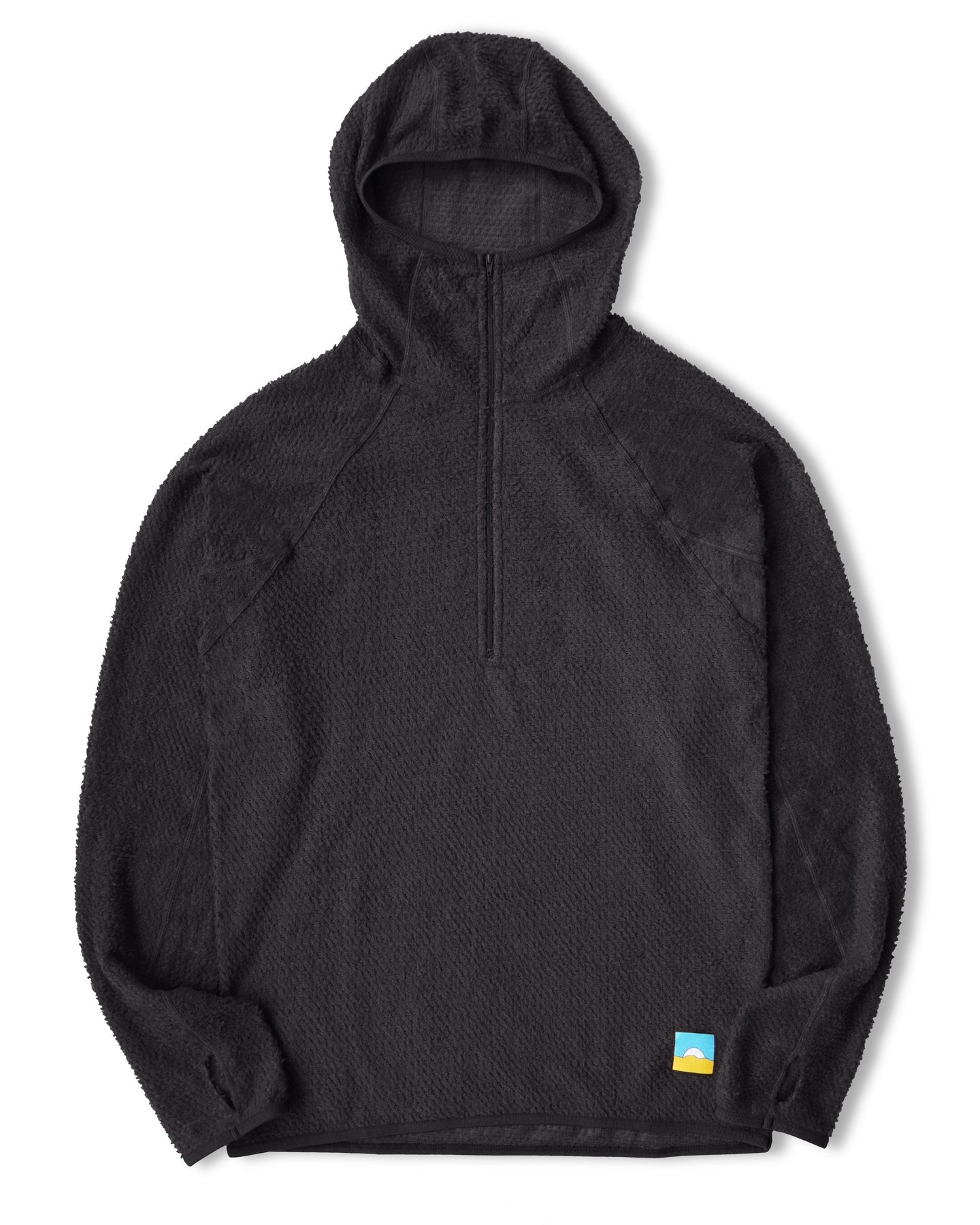 Features include flat-seam construction, half-zip YKK front for ventilation, balaclava-style hood, thumb loops, and reinforced elastic cuffs. Ideal for high-output and varied conditions like thru-hiking or alpine touring.